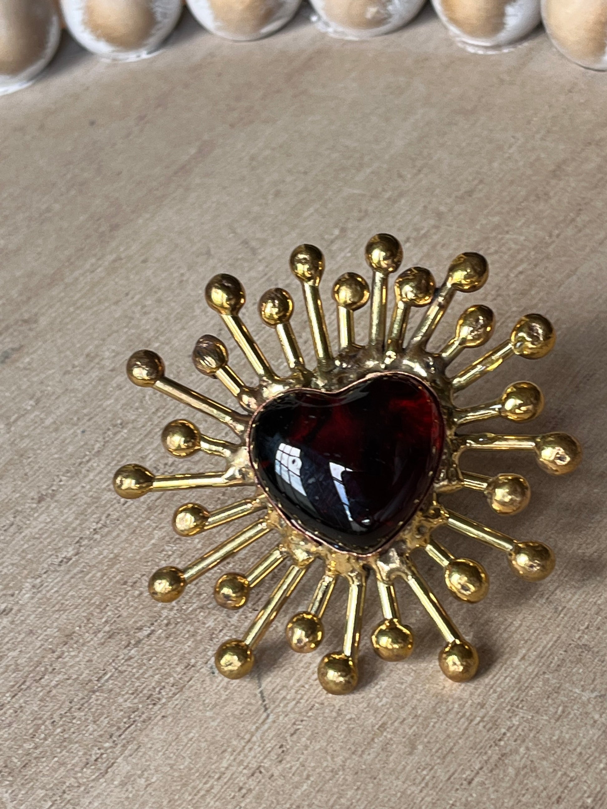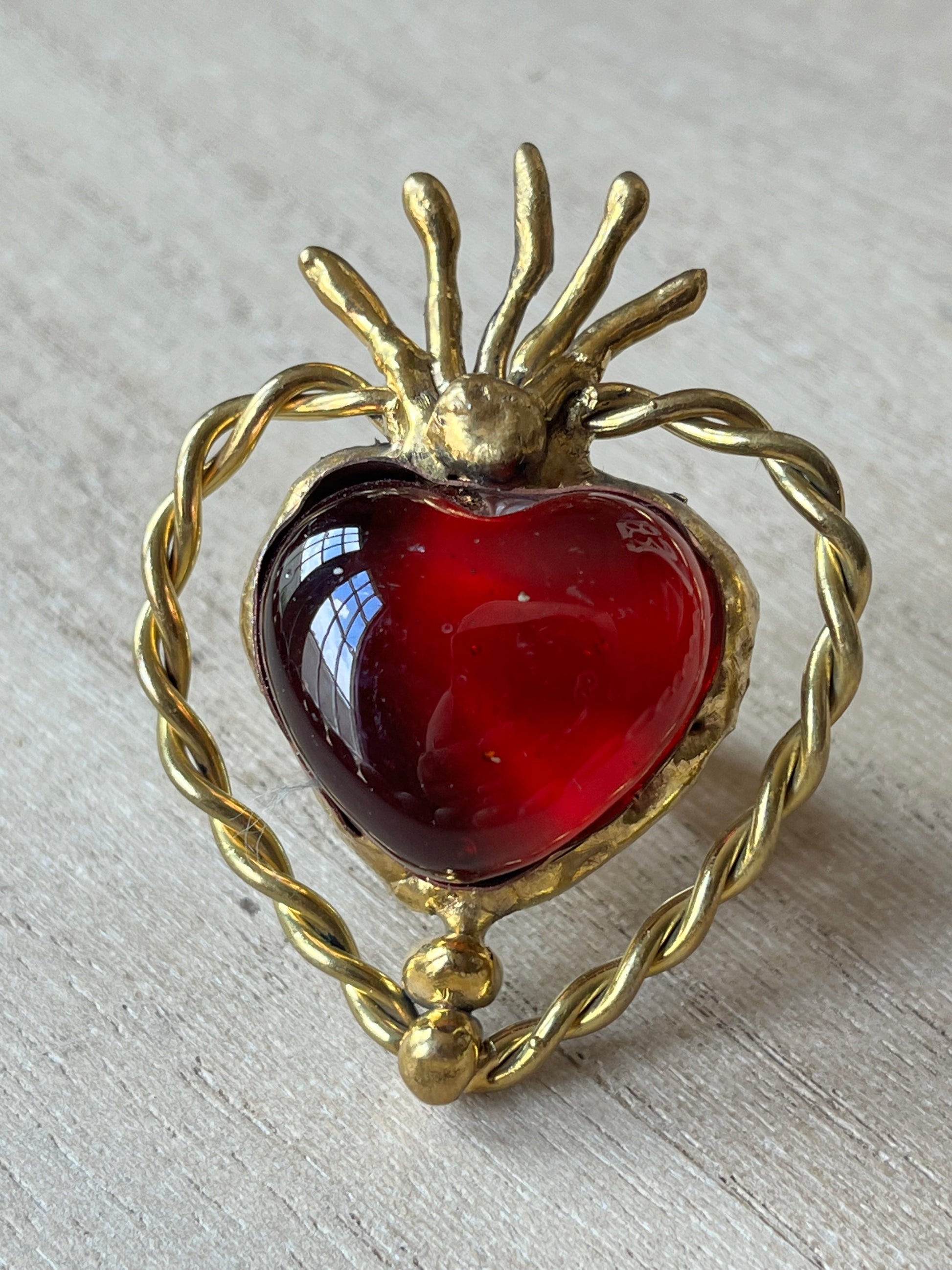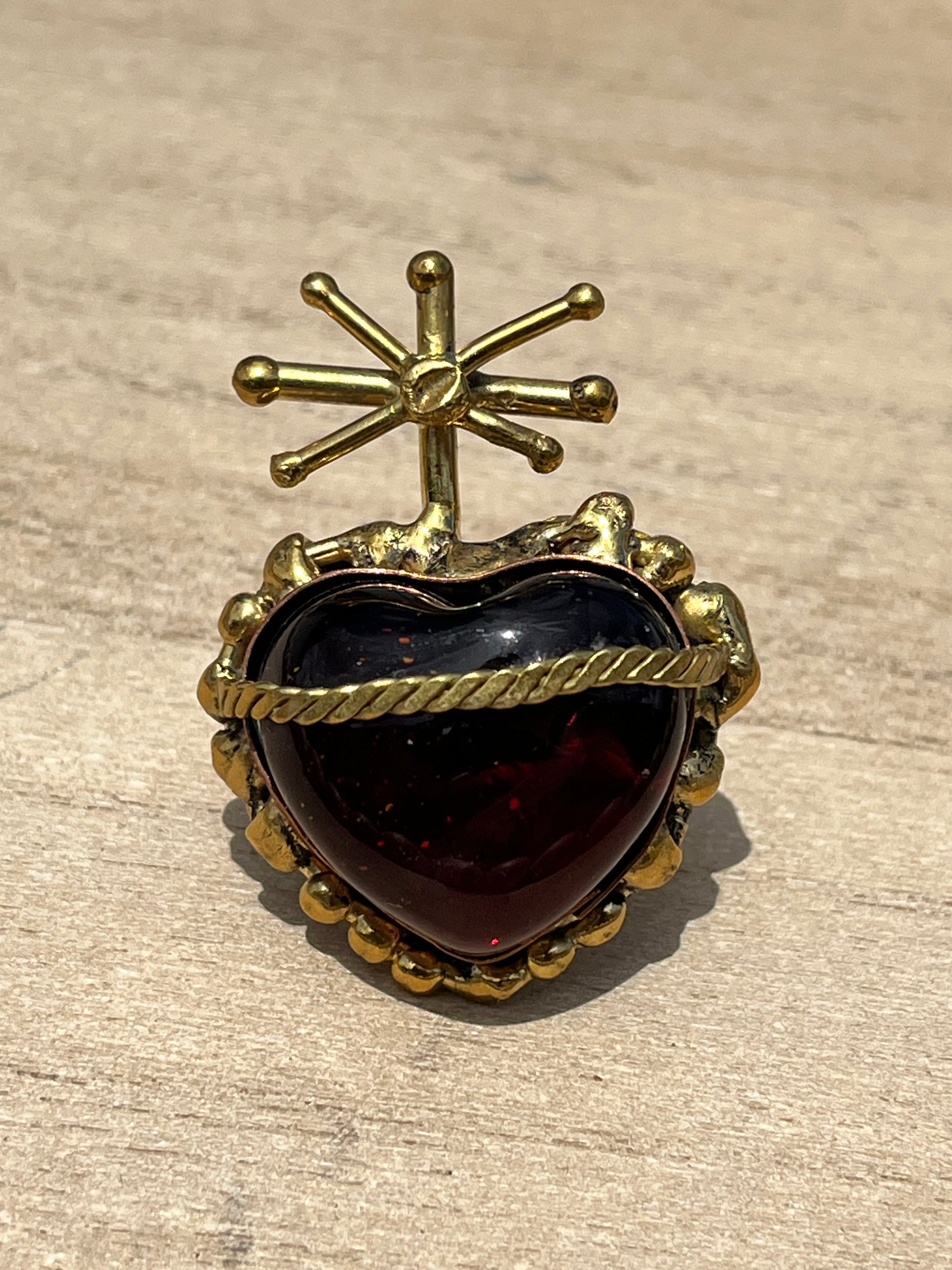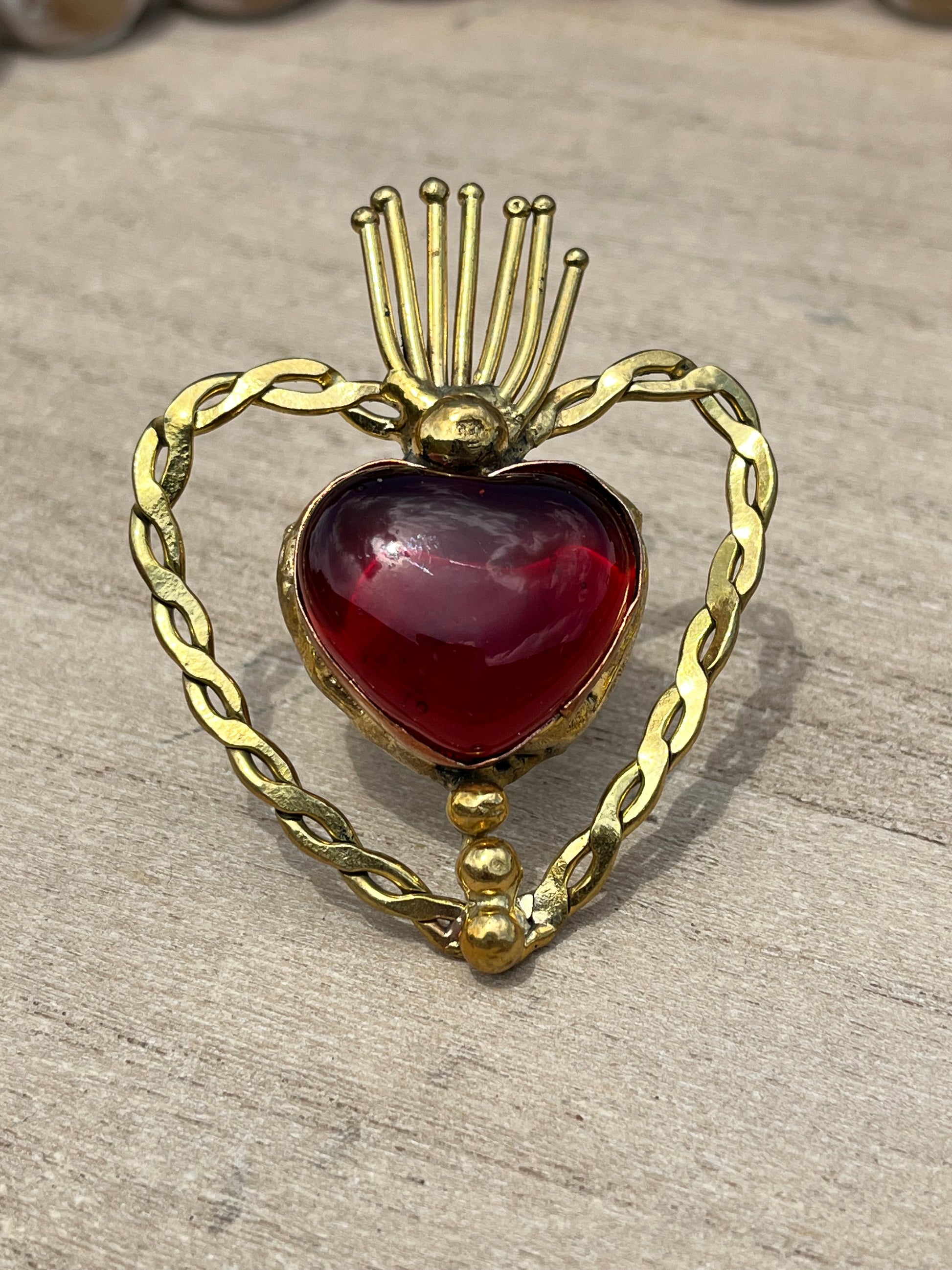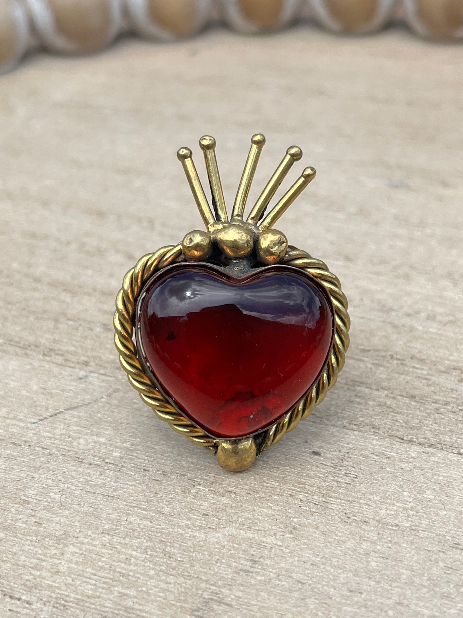 Handcrafted in San Miguel de Allende, this stunning ring features a vibrant red glass heart framed by a radiant sunburst design. Made from durable Alpaca copper alloy, each piece is a symbol of love, strength, and Mexican folk artistry. Each piece may vary when selected. Design may vary when shipping a product