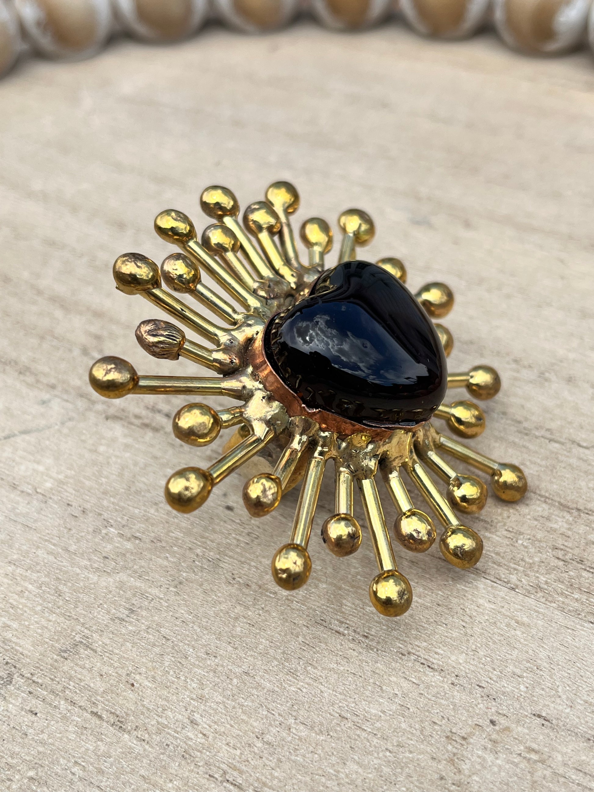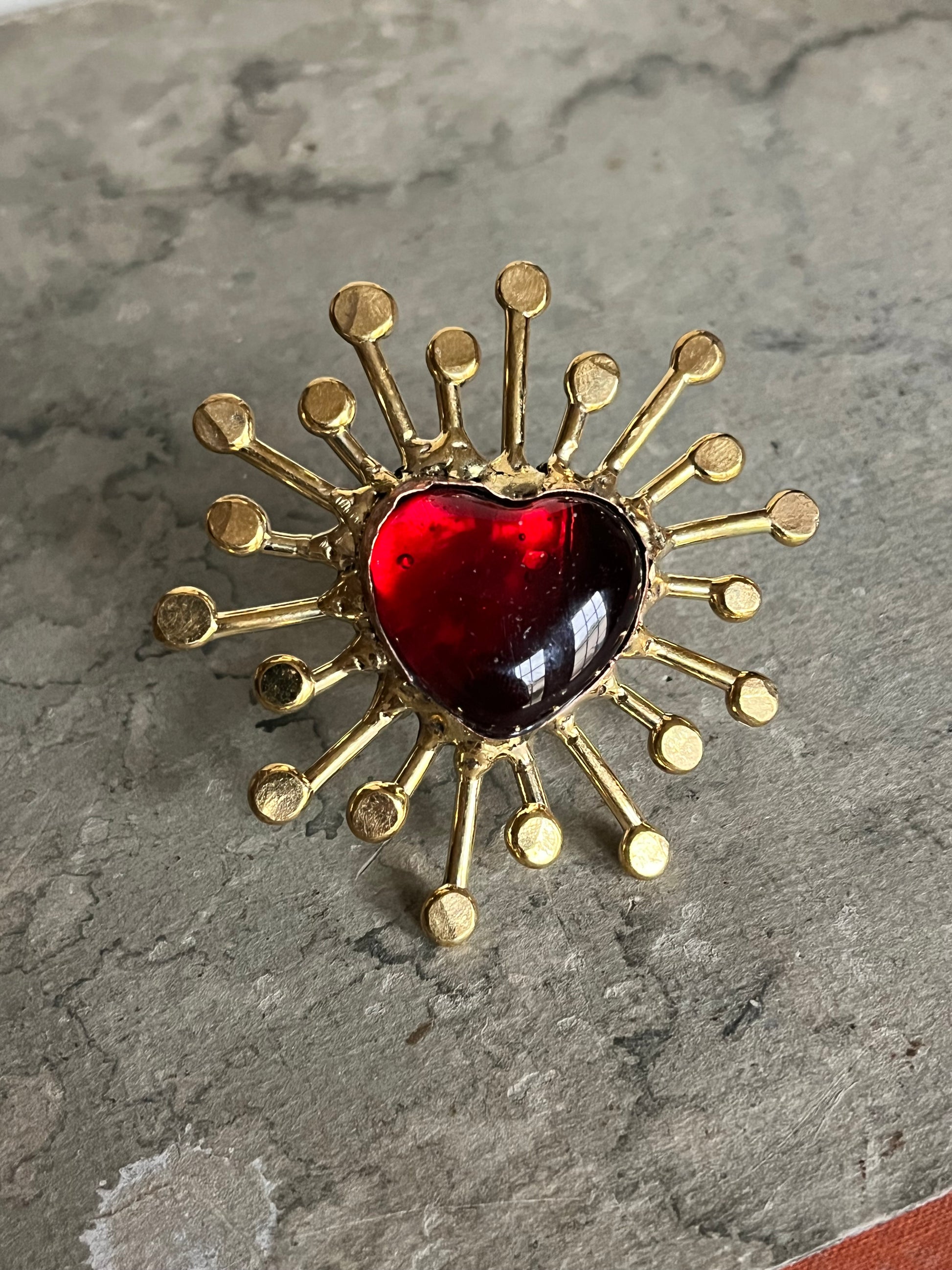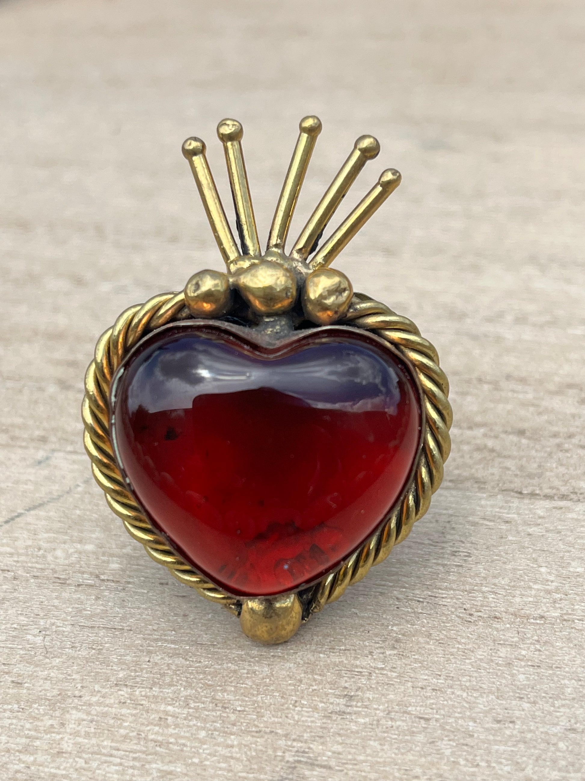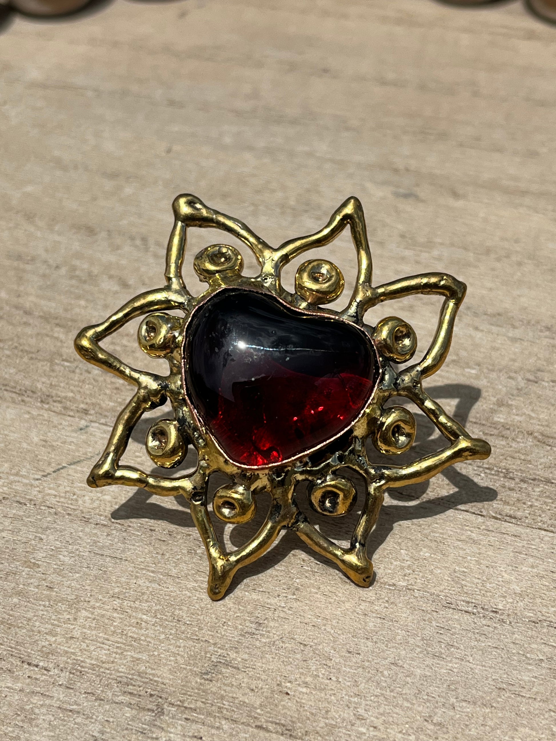 Handcrafted in San Miguel de Allende, this stunning ring features a vibrant red glass heart framed by a radiant sunburst design. Made from durable Alpaca copper alloy, each piece is a symbol of love, strength, and Mexican folk artistry. Each piece may vary when selected. Design may vary when shipping a product