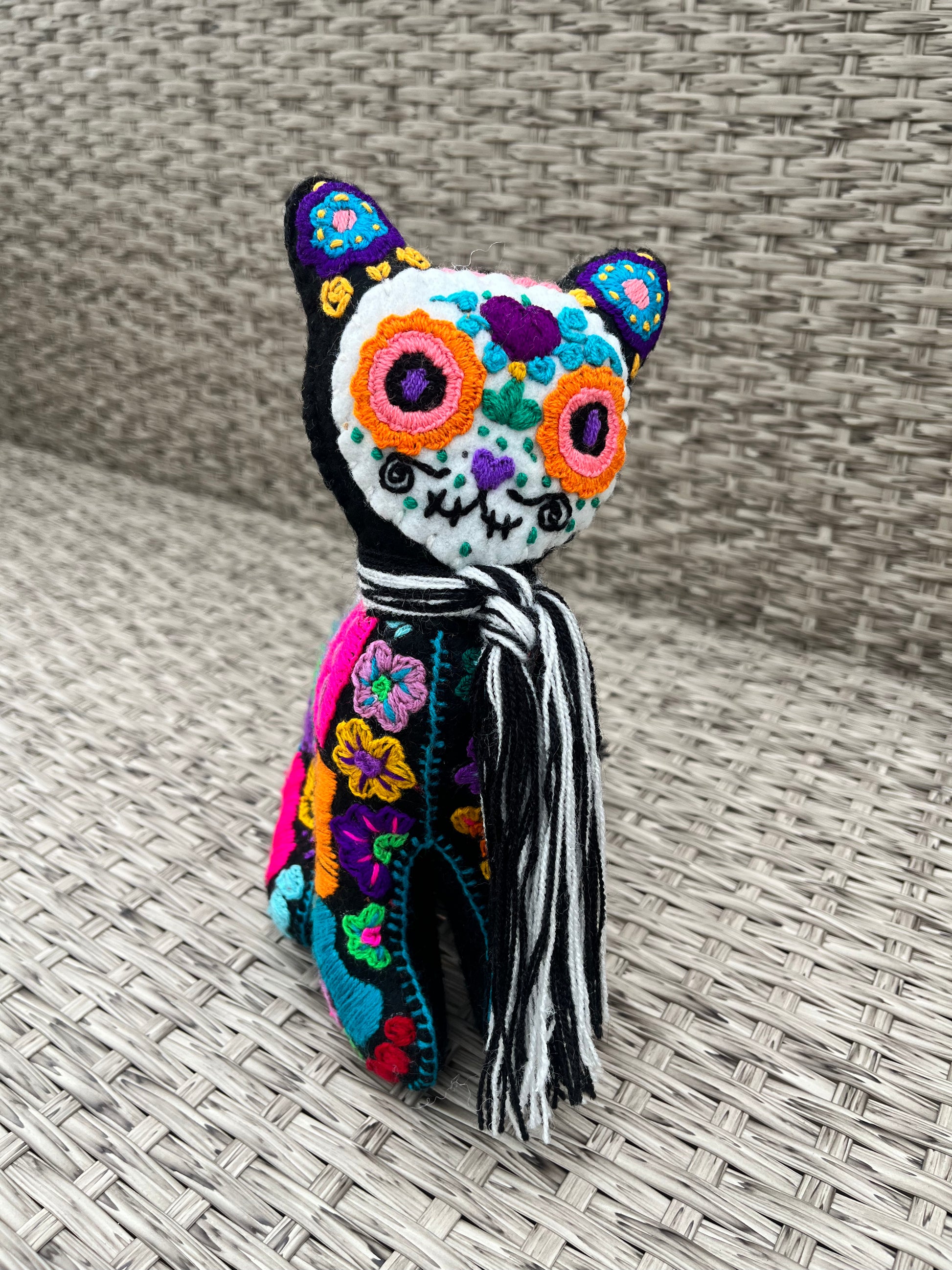Day of the Dead (Día de los Muertos) themed cat plushie-stuffed animal. These items are inspired by the traditional Mexican holiday honoring the dead, featuring colorful designs and skull-like faces.