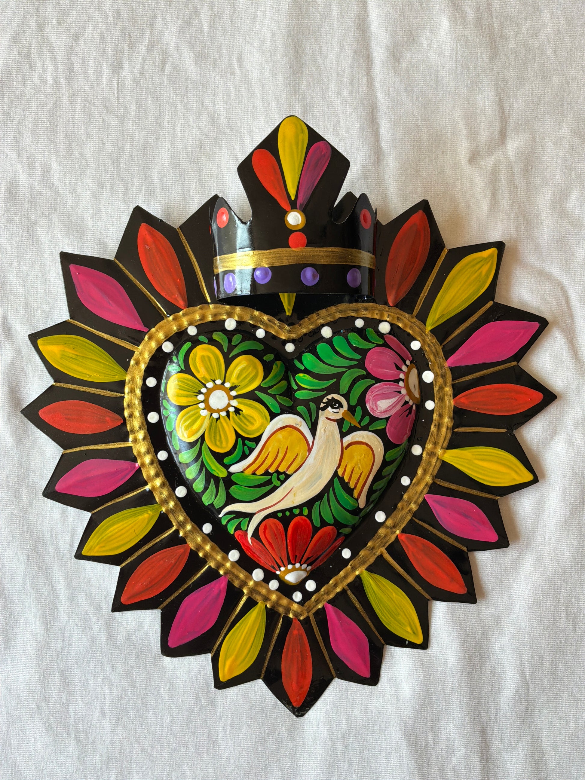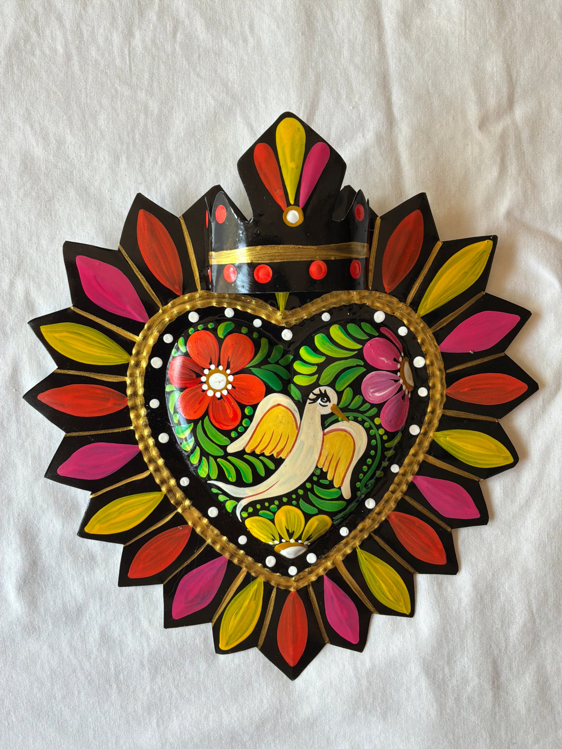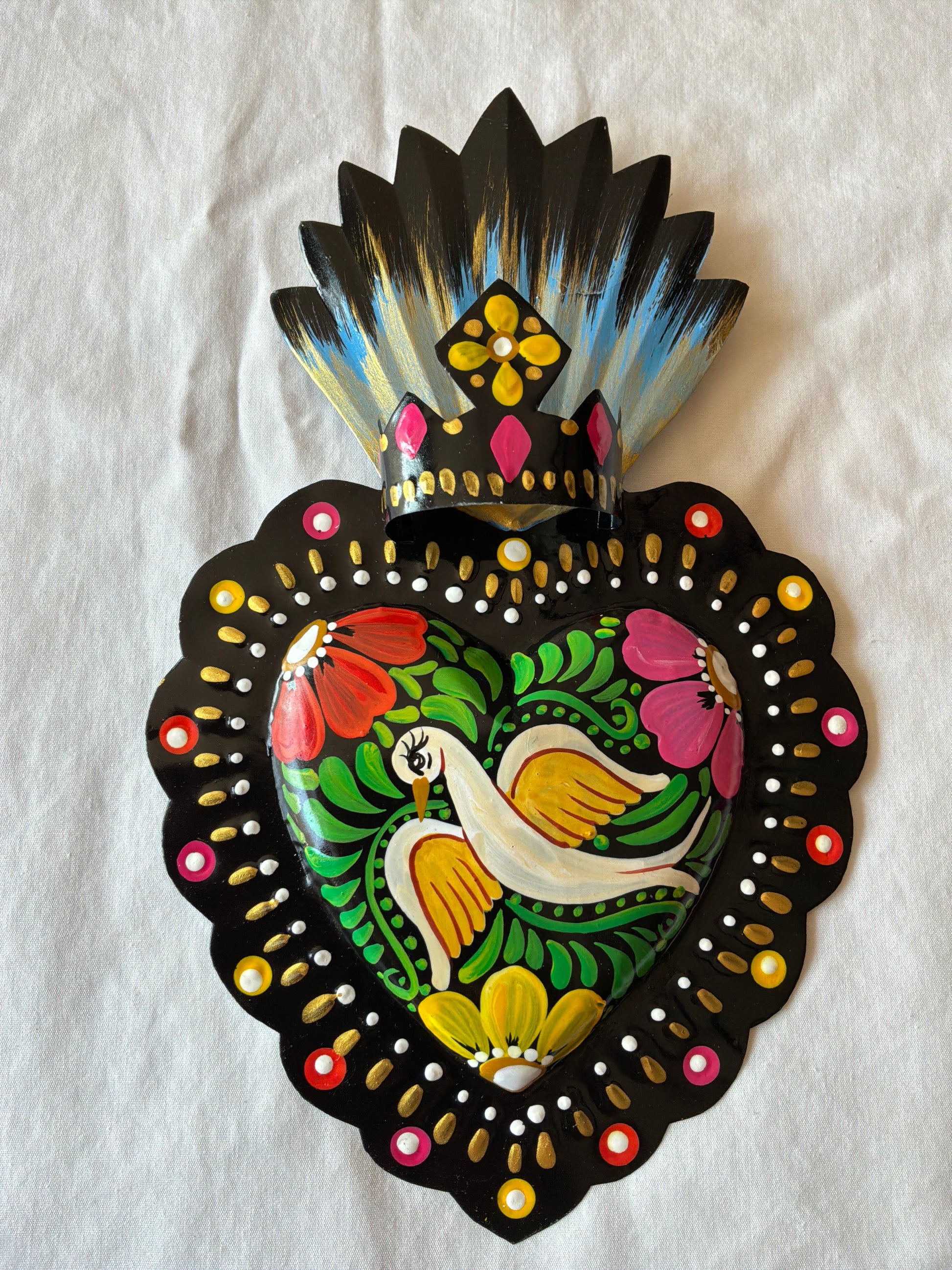 Handmade and Hand Painted Metal Tin Black Otomi Inspired Dove Sacred Heart. 8-9”