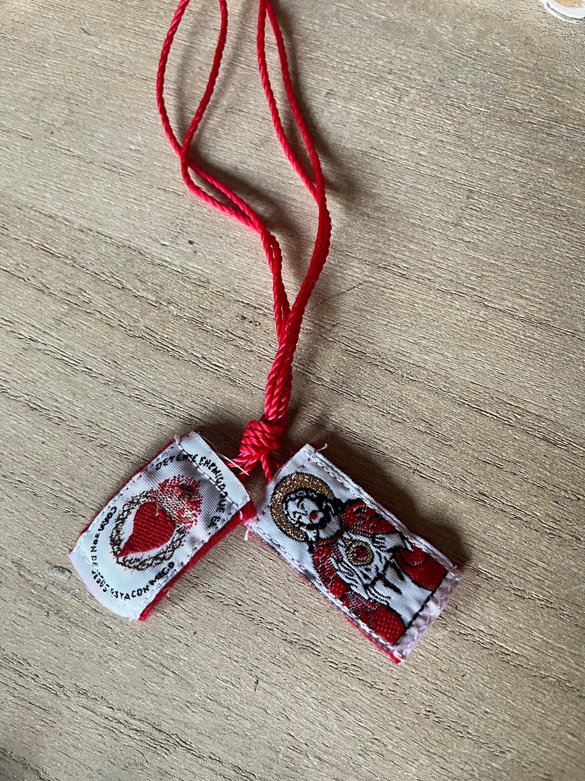 Red Escapulario Necklaces – Traditional double-sided devotional necklaces featuring sacred images, beautifully framed in vibrant red fabric. Worn for protection, faith, and style, these handmade pieces carry spiritual meaning while adding a bold touch to any outfit. Perfect for gifting or personal devotion.