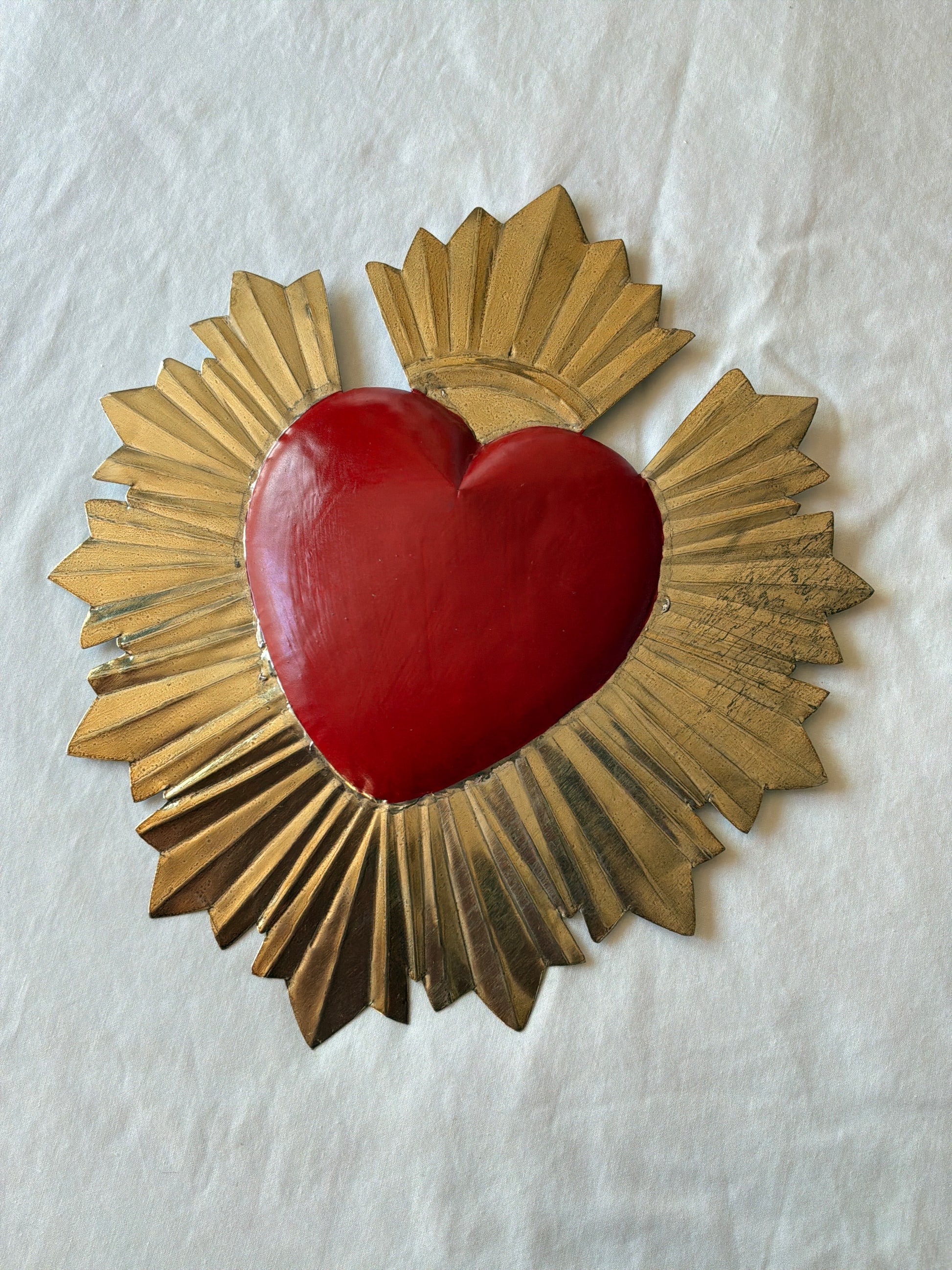 Handmade Ex-Voto Gold Sacred Heart wall decor with pink or red enamel center. 10”