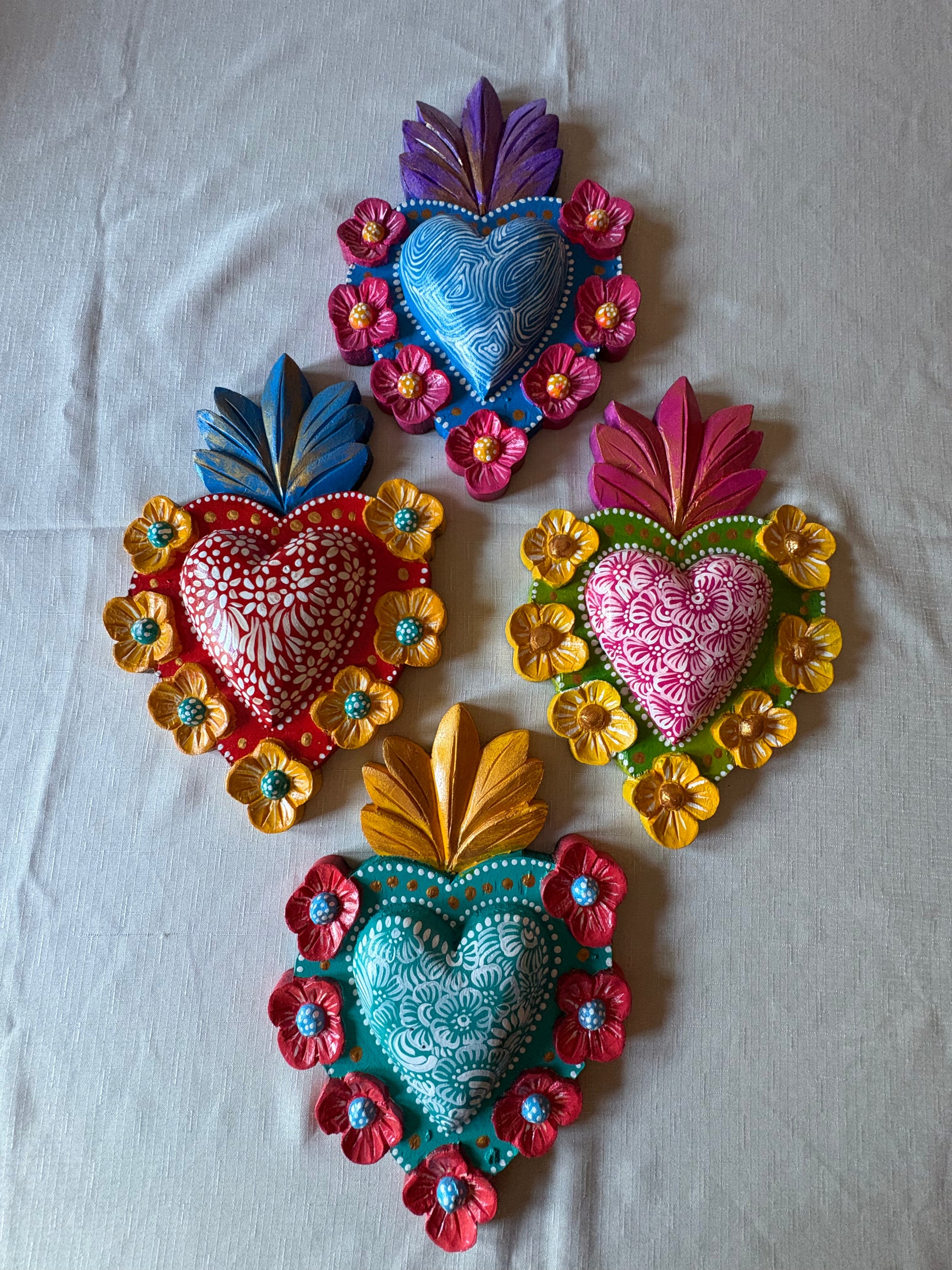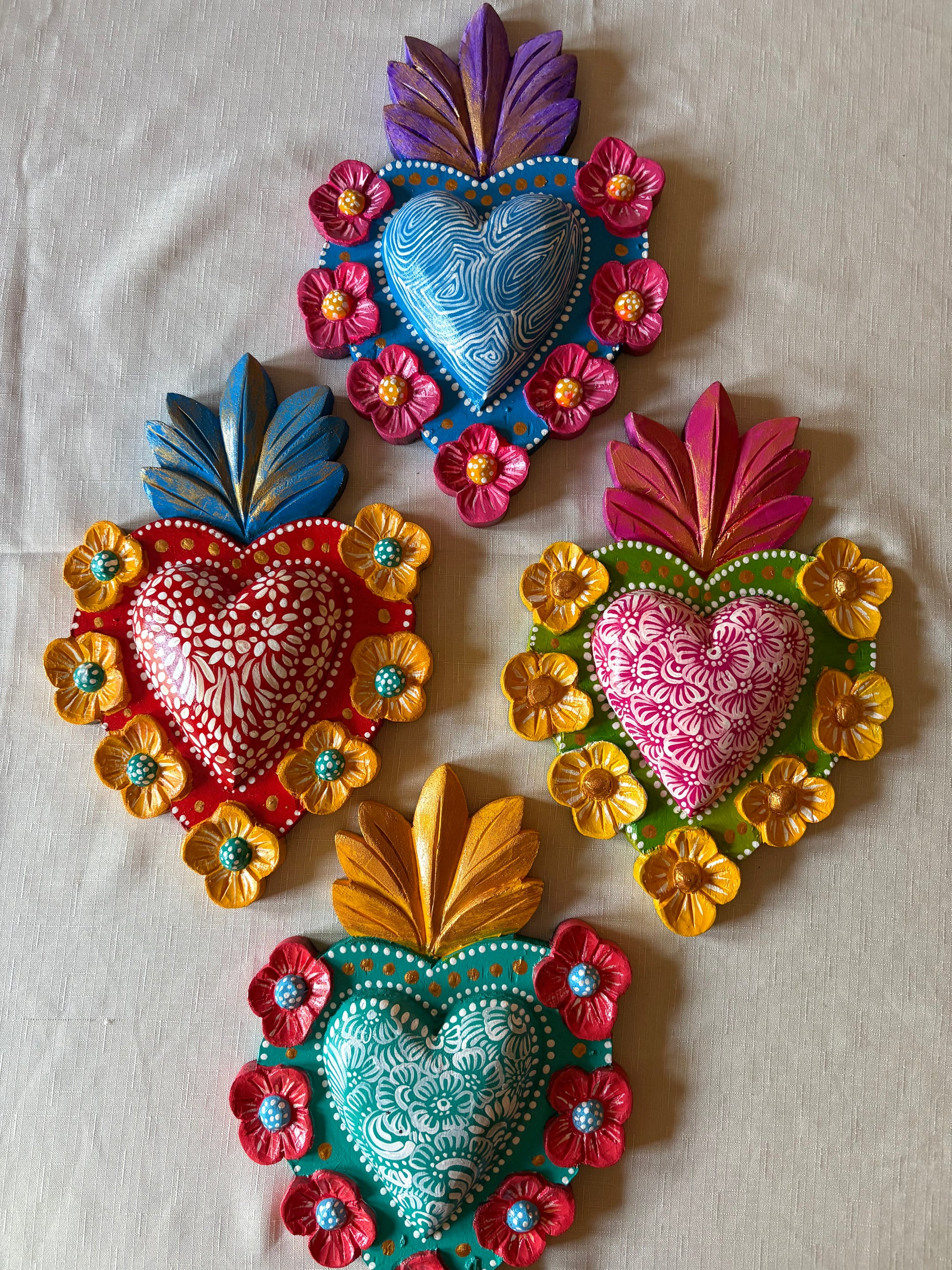 Each heart is decorated in vibrant colors, surrounded by hand-carved and painted flowers, and topped with stylized flames — a traditional feature representing divine love and passion. 12”x9”