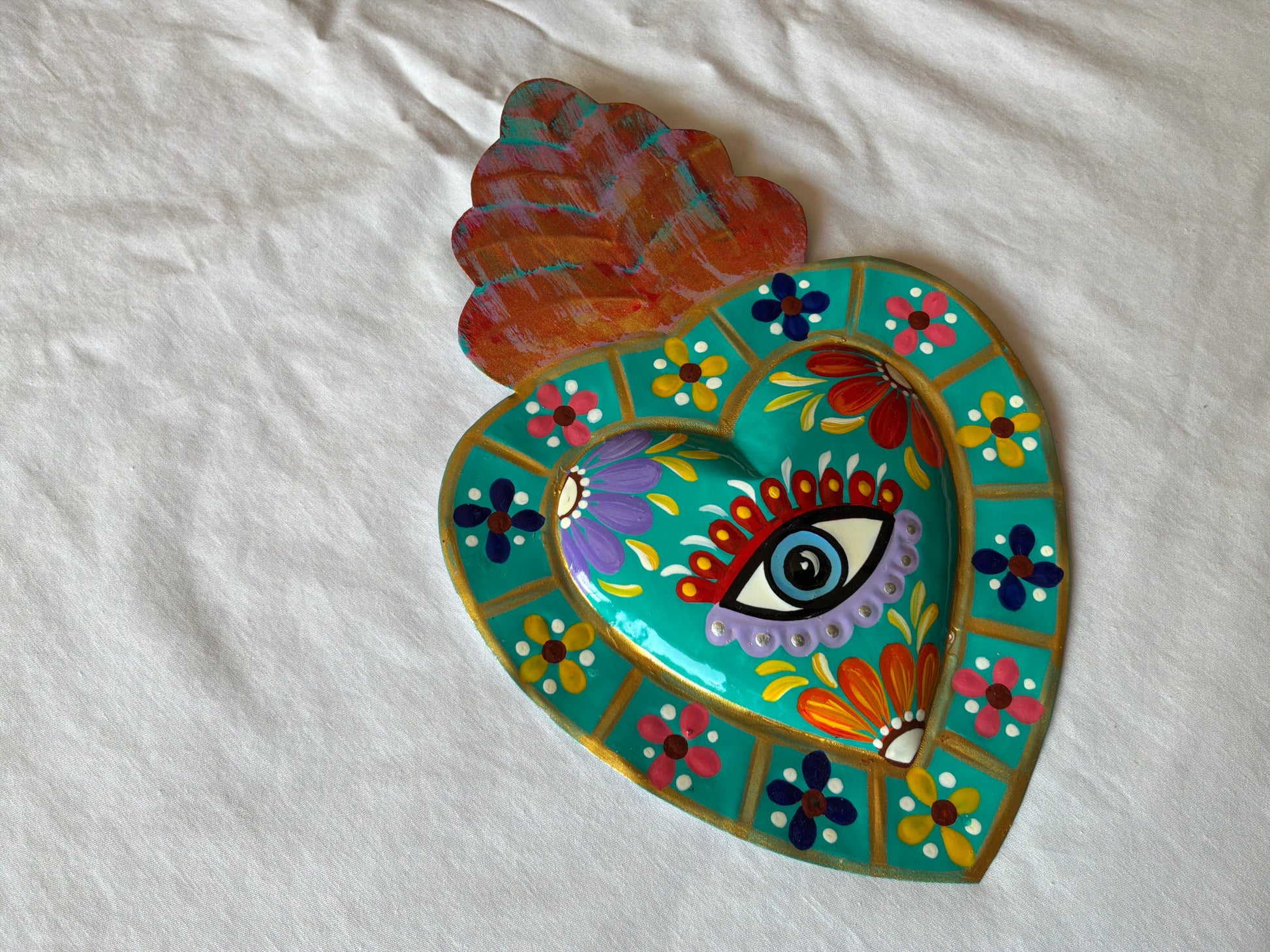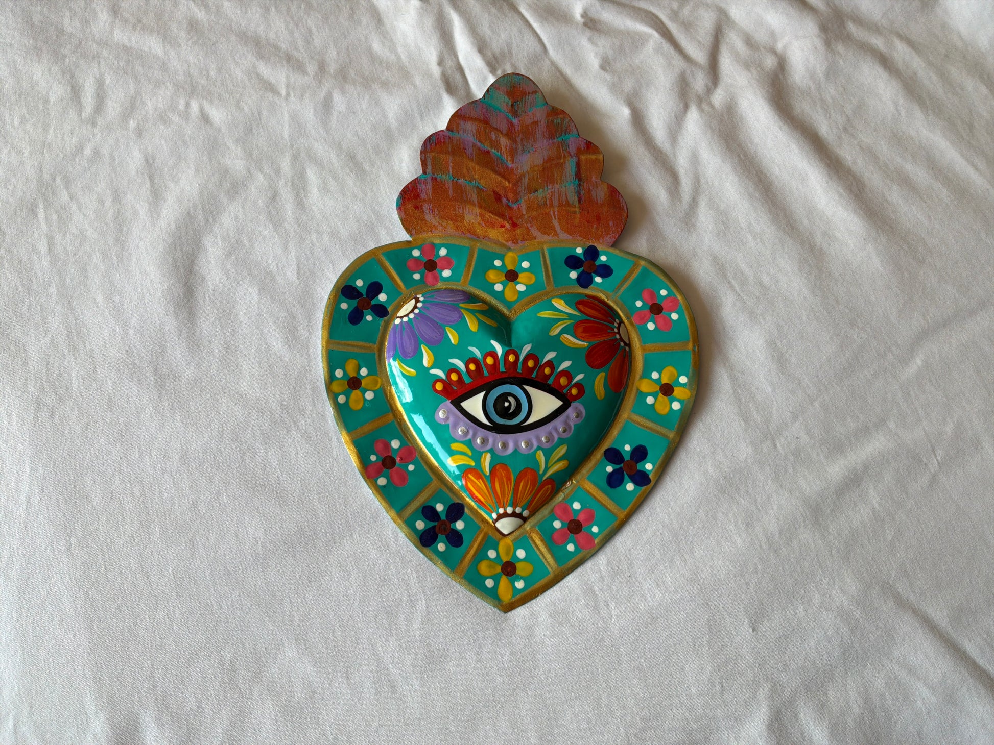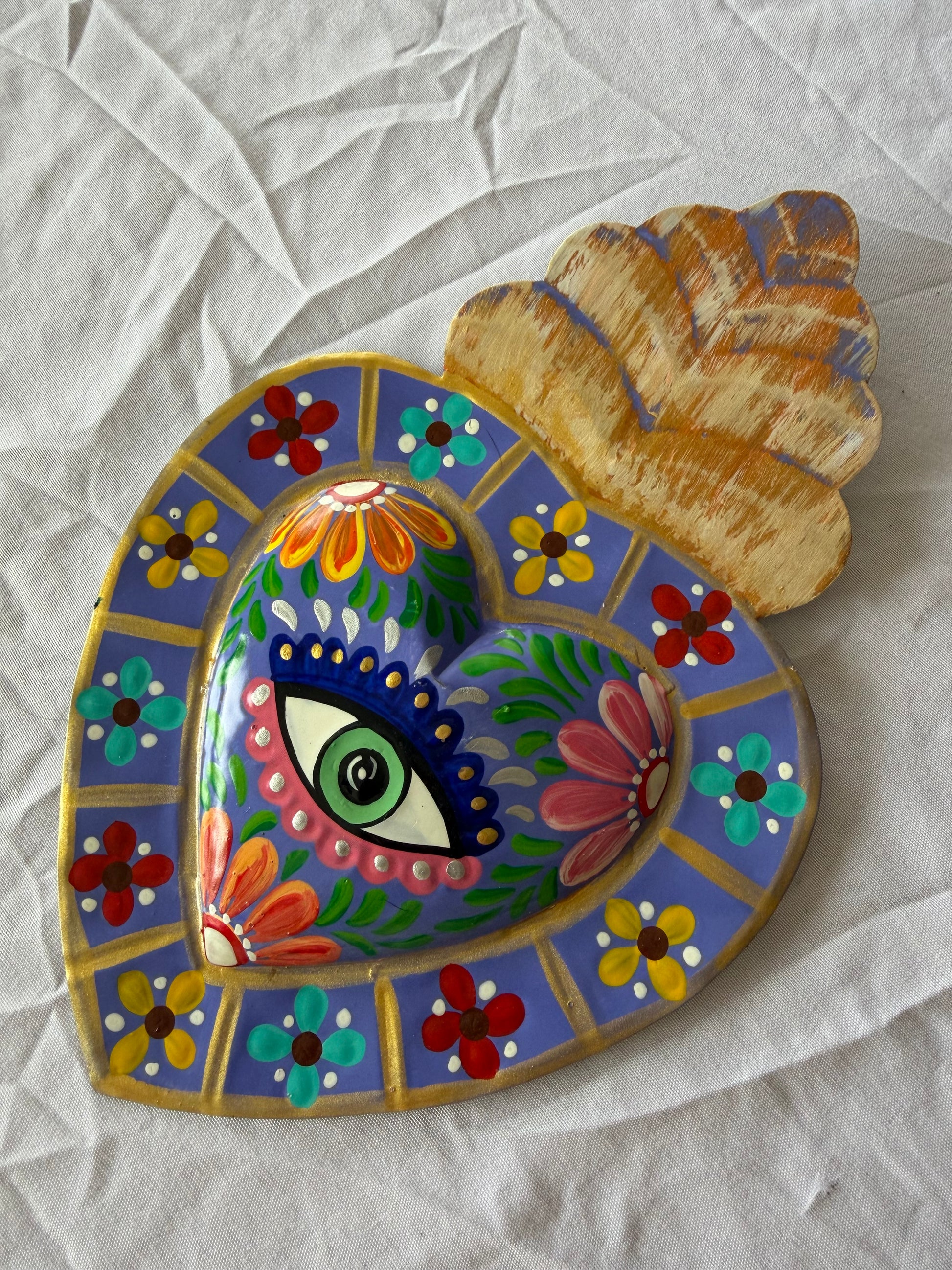Sacred Heart Metal Tin Heart hand painted small 8-10”