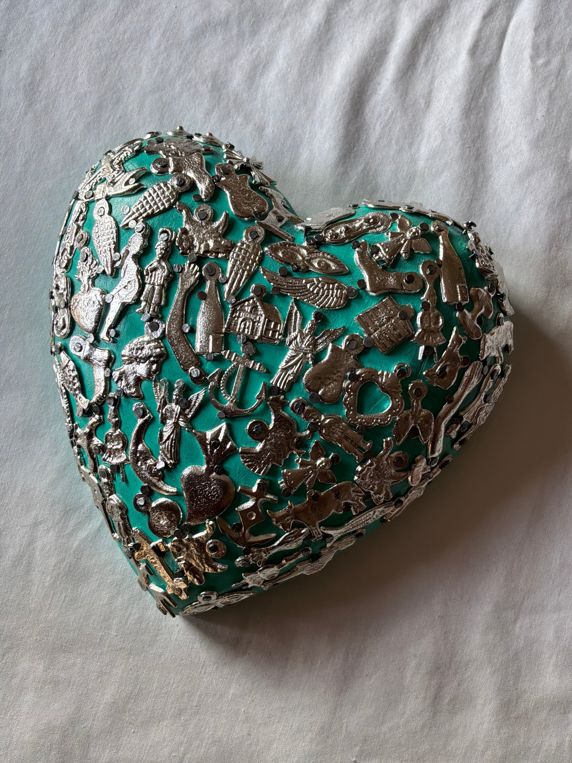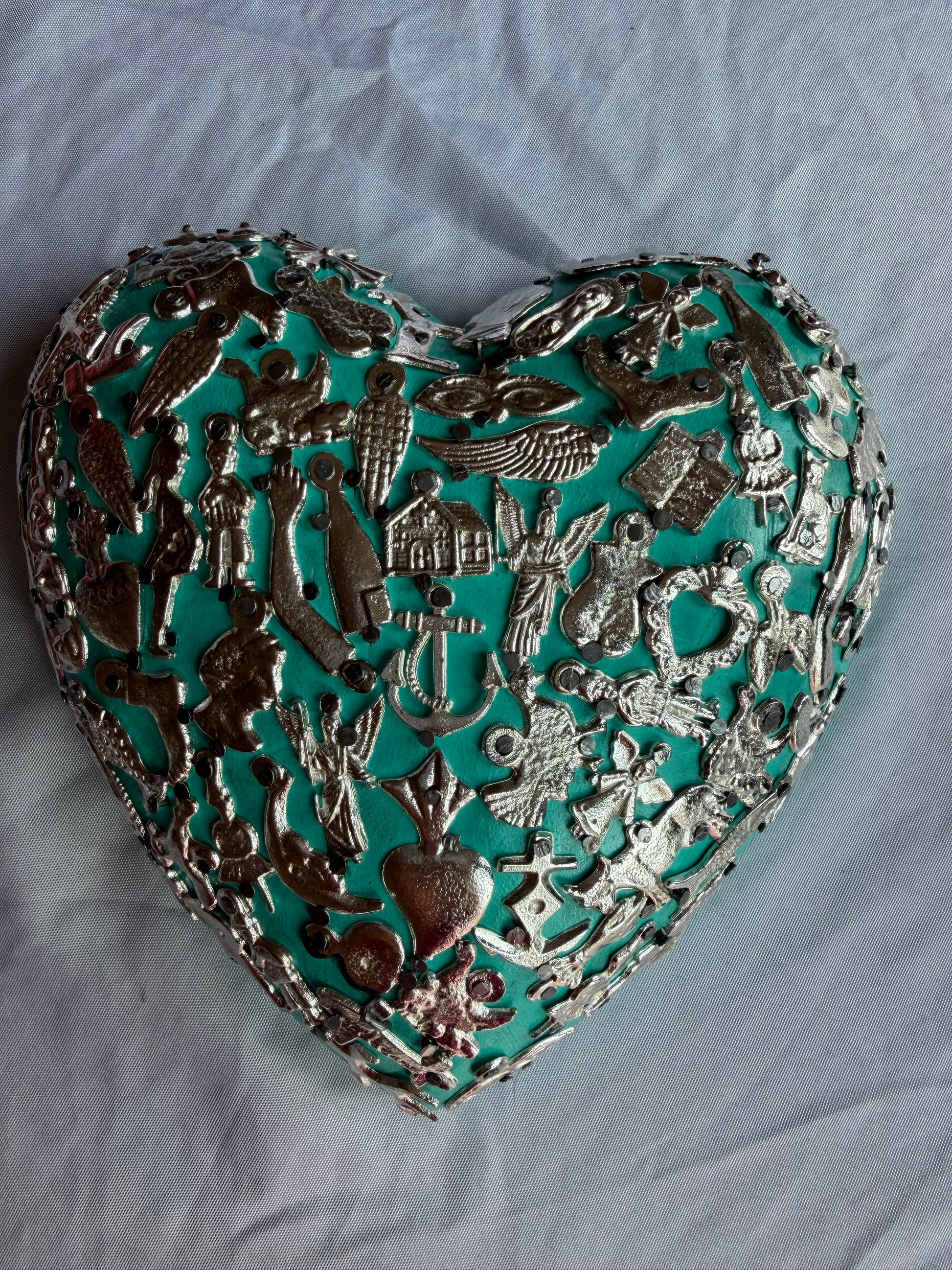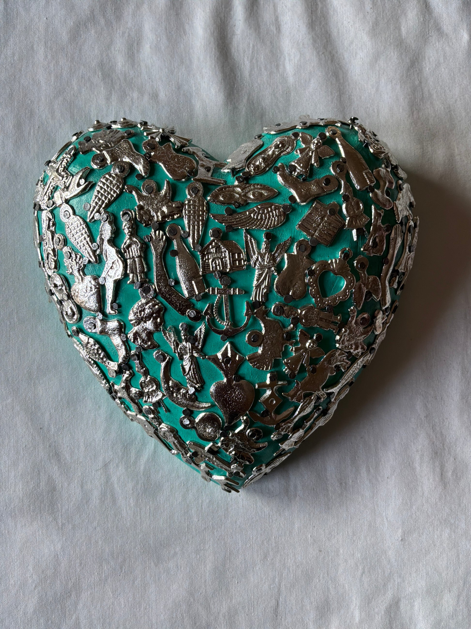 Sacred wooden heart embellished with mini Milagritos devotion to Faith Hope and love. Perfect heart addition to your wall collection