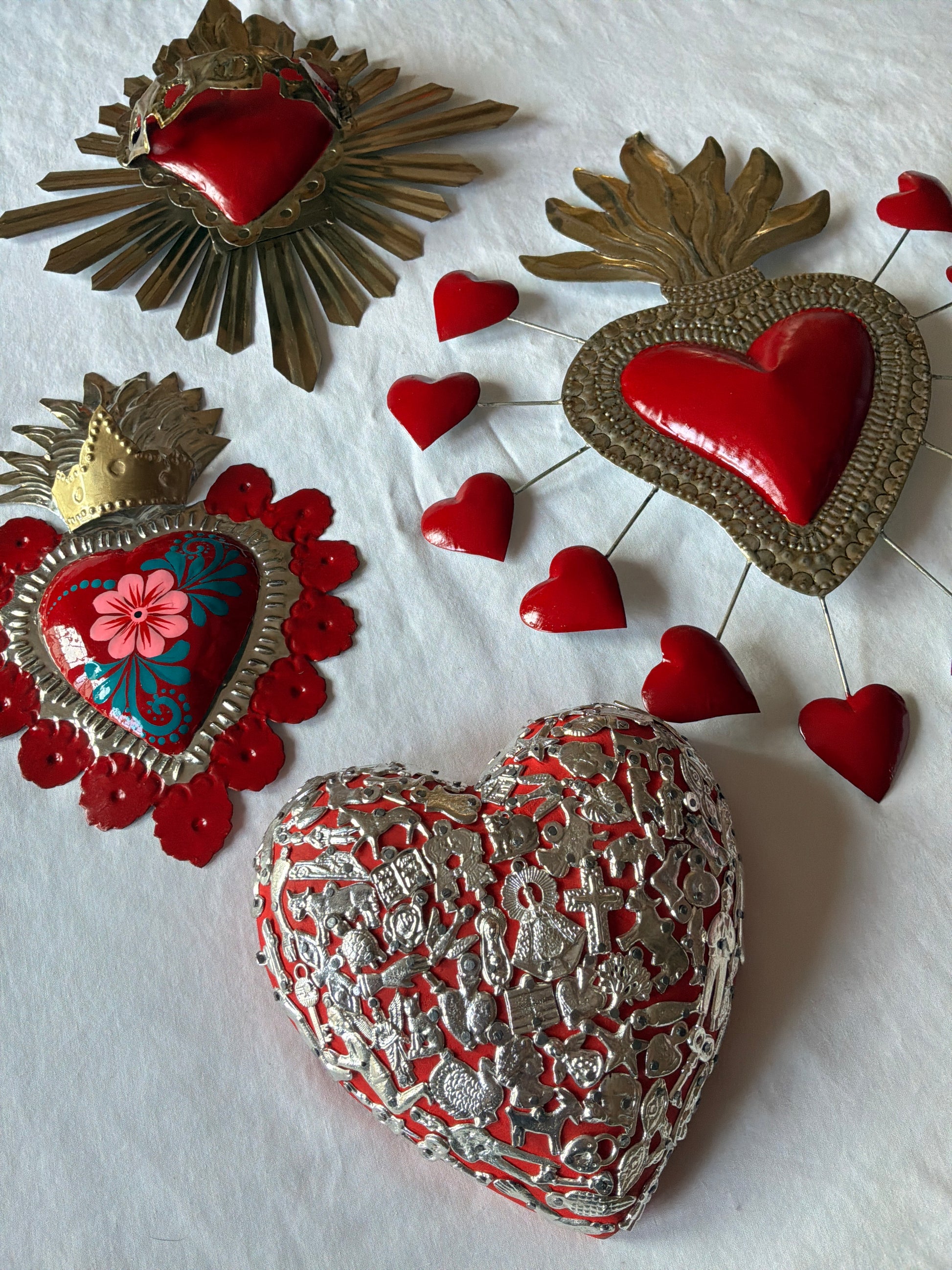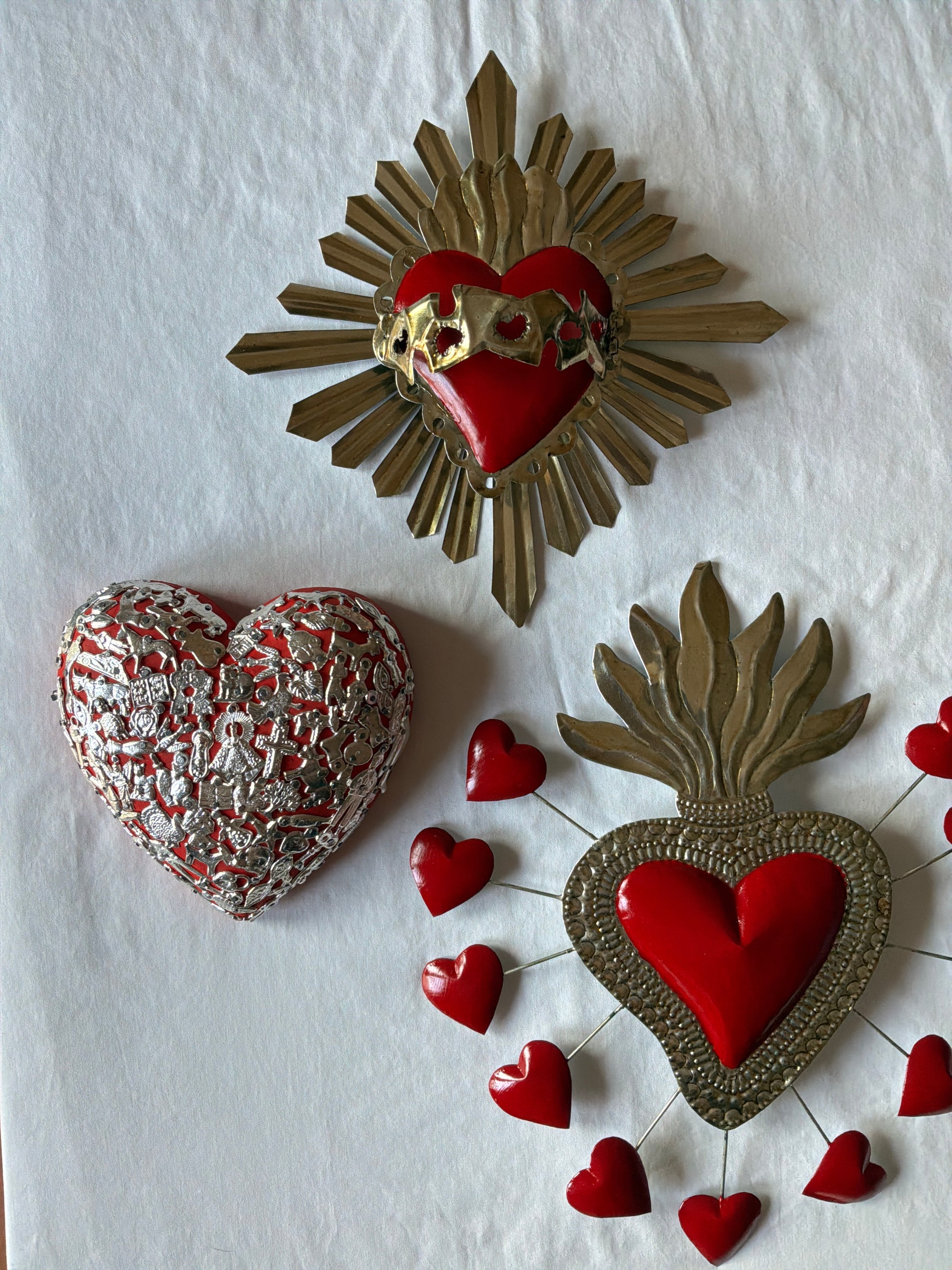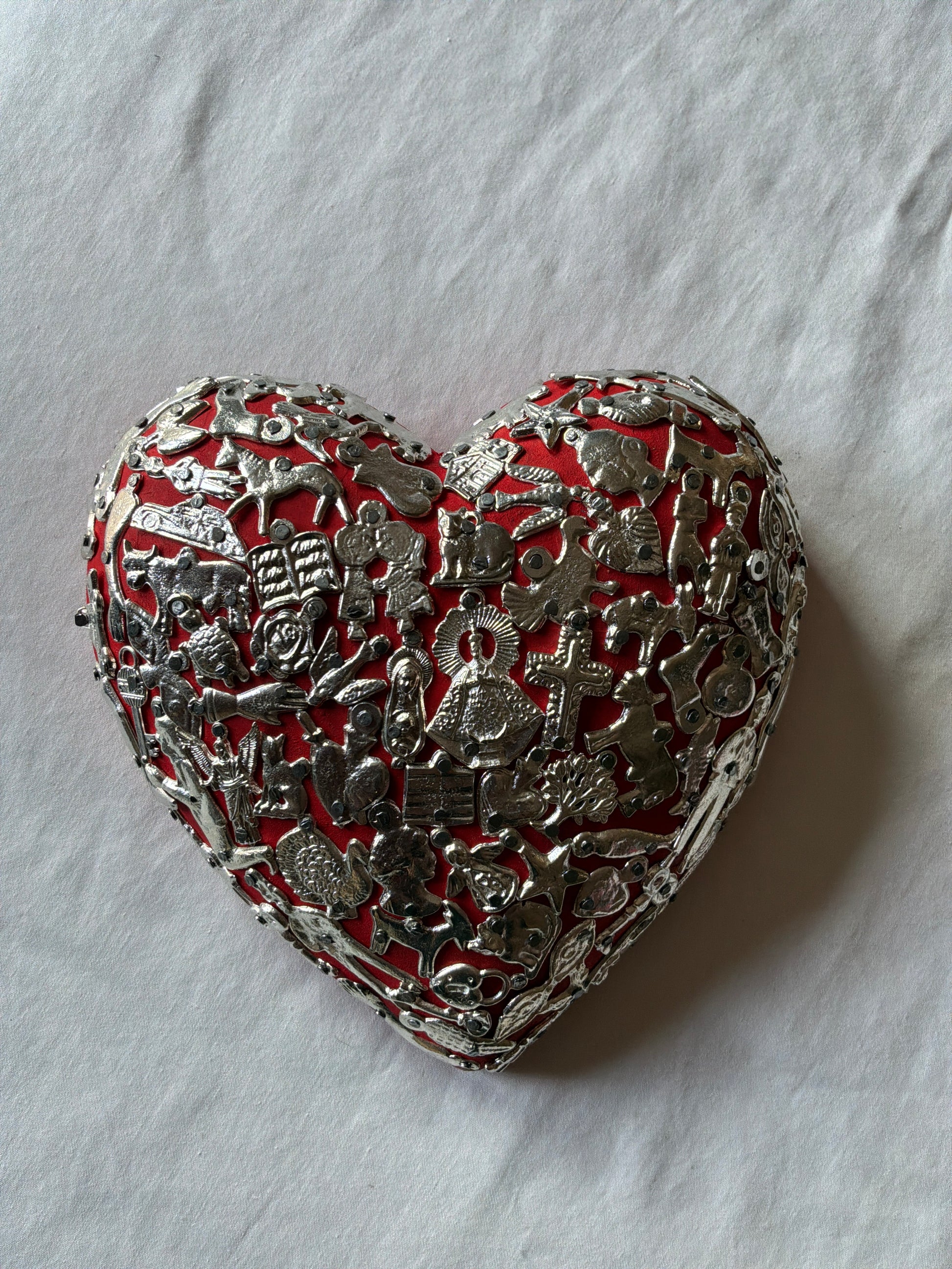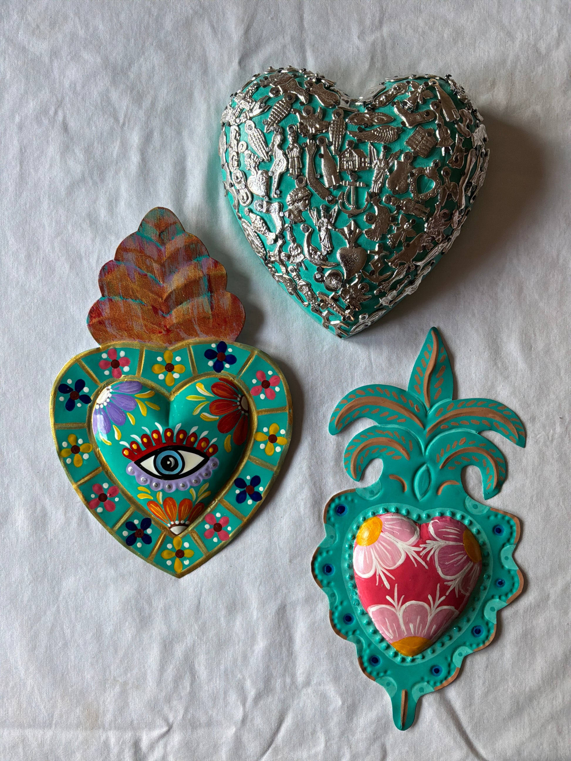 Sacred wooden heart embellished with mini Milagritos devotion to Faith Hope and love. Perfect heart addition to your wall collection