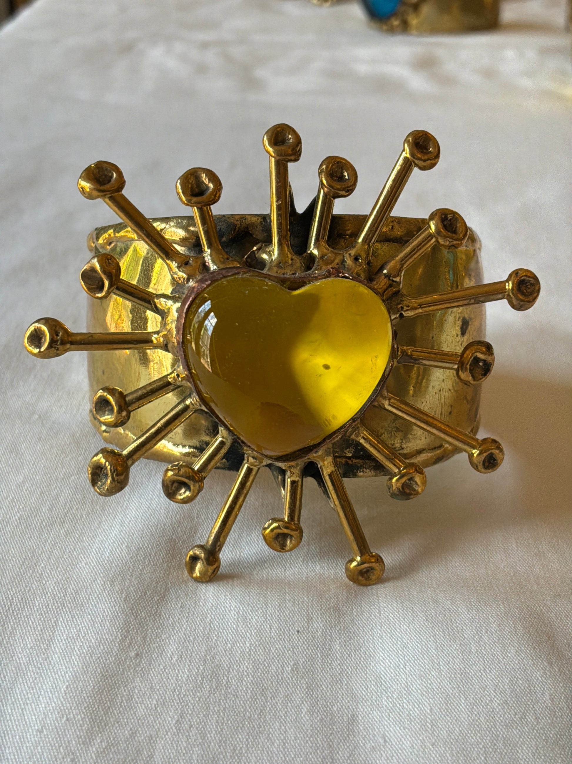 Radiating beauty and symbolism, this Sun Burst Sacred Heart Handmade Cuff Bracelet is a striking piece crafted by skilled artisans. The centerpiece features a vibrant glass sacred heart, surrounded by hand-formed sunburst rays—a powerful emblem of divine love and protection.